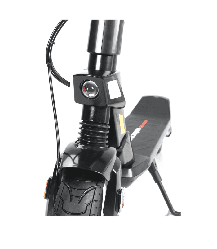 Dotée de suspensions à ressort avant et arrière, de freins tambour avec ABS électronique et de pneus 9 pouces (avant tubeless, arrière plein), elle garantit sécurité et confort sur route humide. L’éclairage LED et les clignotants assurent votre visibilité.