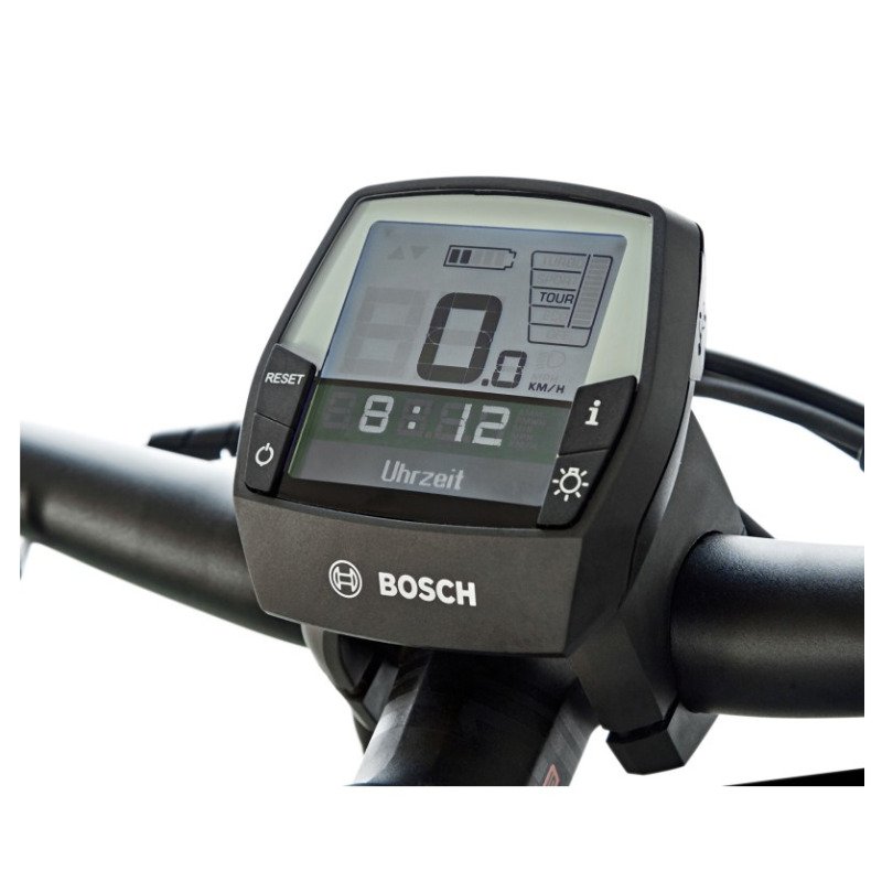 | Console | Bosch Intuvia : console amovible avec commande déportée Port micro-USB pour recharge Affichage : niveau d’assistance, charge batterie, vitesse instantanée, moyenne et max, kilométrages journalier et total, rétro-éclairage |